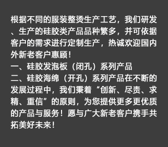 我公司生產(chǎn)的硅膠海綿(開孔)系列產(chǎn)品具有耐高溫、透氣性好、耐壓性強等優(yōu)點,是西服及高檔服裝整燙生產(chǎn)的必備產(chǎn)品。硅膠發(fā)泡板(閉孔)系列產(chǎn)品具有發(fā)泡均勻,耐高溫、耐壓性能好,其中新研制開發(fā)的針孔浮點硅膠發(fā)泡板攻克了一般產(chǎn)品的浮點不飽滿的技術(shù)難題,一般產(chǎn)品的浮點不飽滿,容易擋住透氣孔,造成吸風效果不良。我司的產(chǎn)品具有更好的透氣性和回彈性,以及更長時間的試用壽命。